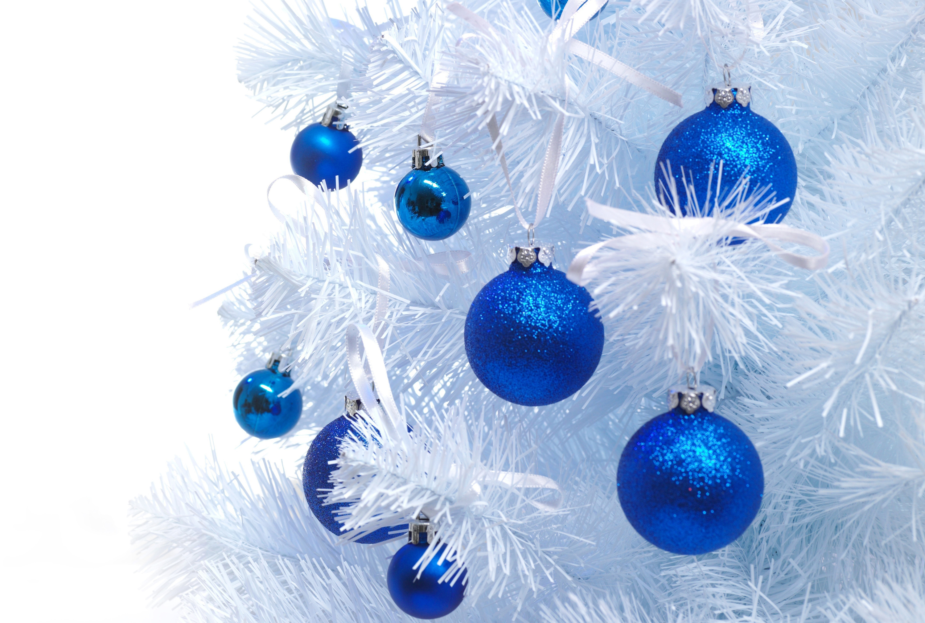 Пушистая белая ель с синими шариками с сапфировым отливом.