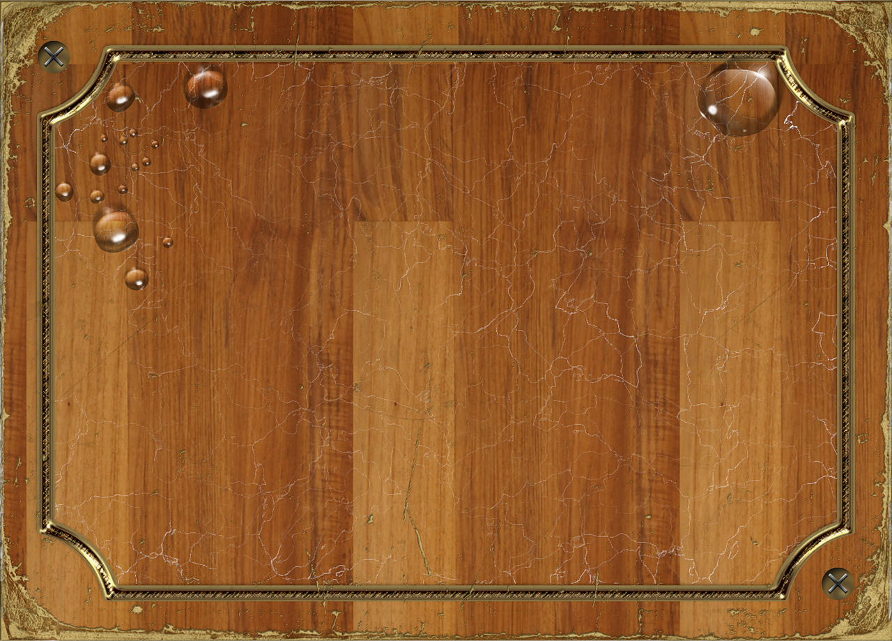 Винтажный фон, имитирующий древесину с золотым тиснением. Особую нотку вносят ловко сделанные в фотошопе капельки дождя, усиливая впечатление очень старой вещи.