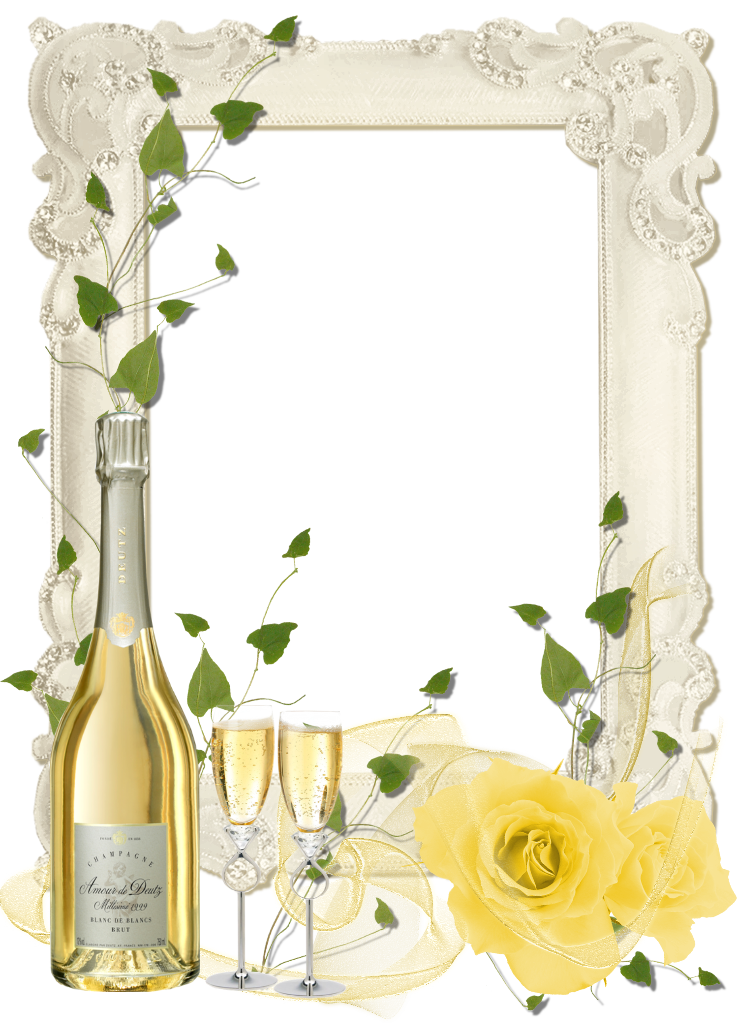 Белая png фоторамка лепнина, украшенная веточками, желтыми розами и бутылкой шампанского в золотой обертке.