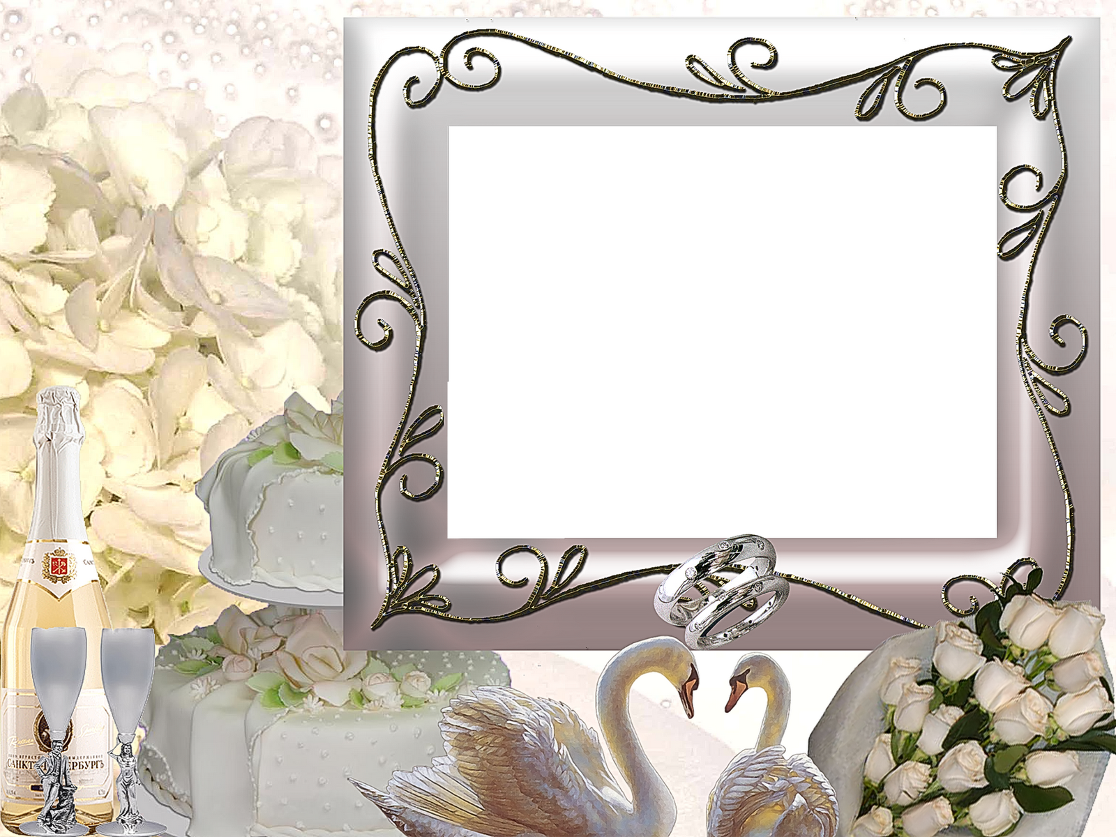 Свадебная пнг рамка из белого золота. Обручальные кольца, элитное вино, пара лебедей и много белых роз - увековечат праздничную фотографию.